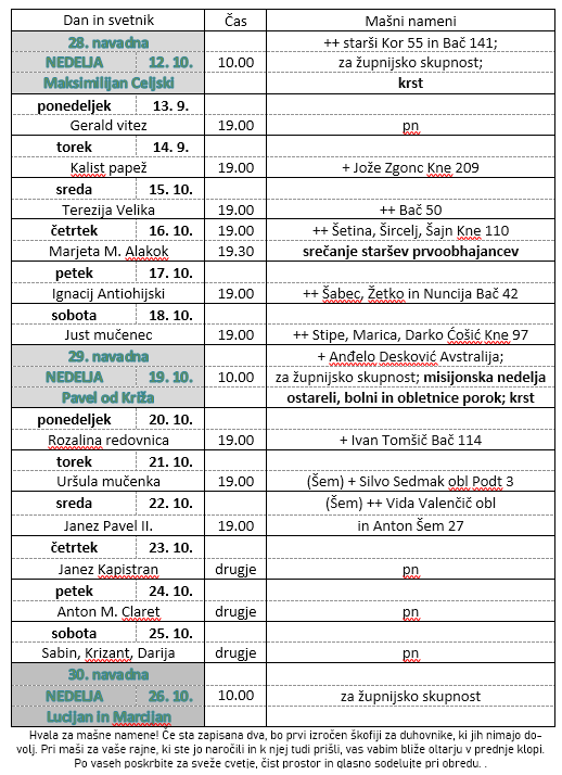 Za vse dokumente, pogreb, obhajilo bolnikov ali mašne namene pokličite ali se oglasite v župnišču. Maše so redno ob nedeljah ob 10. 00 (poleti ob 9.00), na delavnike zvečer (izjemoma zjutraj), redno v Knežaku, sicer je naveden kraj. Zaradi pogreba, osmine in maše 30. dne lahko pride do sprememb.